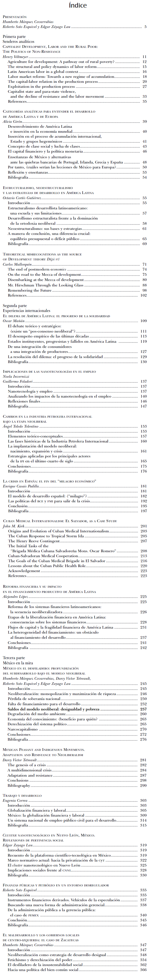 Coordinadores: Humberto Márquez Covarrubias, Roberto Soto Esquivel, Edgar Záyago Lau (2011), El desarrollo perdido. Avatares del capitalismo neoliberal en tiempos de crisis. Colección Desarrollo y Migración. México: Miguel Ángel Porrua y UAZ. ISBN 978-607-401-482-2 |